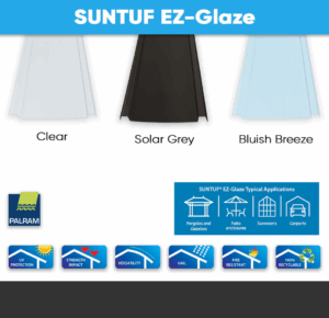 Suntuf EZ Glaze is a single-layer, corrugated polycarbonate roofing sheet known for its strength, clarity, and ease of installation. It’s often the go-to choice for projects like patios, verandas, DIY greenhouses and outdoor entertaining areas.